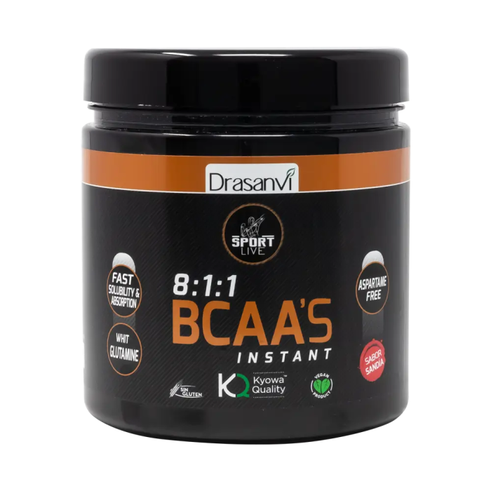 Los aminoácidos ramificados, también llamados BCAA?s (Las siglas de Branched-Chain Amino Acids) son tres: Leucina, Isoleucina y Valina. Se trata de aminoácidos esenciales que nuestro cuerpo no es capaz desintetizar por sí mismo, siendo necesario incorporarlos en nuestra dieta.Los aminoácidos son las unidades esenciales de las proteínas, queposteriormente entran a formar parte de músculos, cartílagos e, incluso, son fundamentales para el sistema inmunitario. En ciertas situaciones como el ejercicio intenso, nuestro cuerpo degrada los aminoácidos que forman parte de nuestras proteínas musculares. Por este motivo, y en esta situación, es interesante el consumo de aminoácidos ramificados. Siguiendo las recomendaciones de los últimos estudios publicados, incluimos una proporción de BCAA?s 8:1:1 (L-Leucina, L-Isoleucina y L-Valina, respectivamente), con mayor cantidad deL-Leucina que la proporción utilizada tradicionalmente, de 2:1:1. La fórmula está reforzada con L-Glutamina.