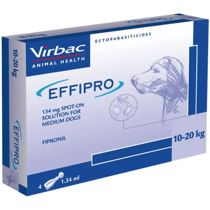 Pipetas antiparasitarias Effipro para perros entre 40 y 60 kg de peso El Laboratorio Virbac ha creado las pipetas antiparasitarias de Effipro, diseñadas especialmente para el cuidado de los perros muy grandes que pesan entre 40 y 60 kg.Este producto es efectivo para la eliminación y prevención de pulgas (Ctenocephalides spp) y garrapatas (Rhipycephalus sanguineus, Ixodes ricinus y Dermacentor reticualtus). Se trata de un antiparasitario que se aplica de manera externa y con mucha facilidad gracias a su sistema spot-on. Es de los productos para perros más valorados por sus dueños, ya que les ayuda a mejorar la calidad de vida de sus peludos amigos al eliminar las molestas pulgas y garrapatas, así como el incesante picor que causan. Las pipetas Effipro suponen un cuidado para perros de larga duración gracias al periodo de ocho semanas en el que se mantiene su efectividad contra las pulgas adultas. En el caso de las garrapatas evita su aparición durante cuatro semanas. Además, si tu perro ya se ha contagiado de estos parásitos, mueren entre 48 horas y una semana después del tratamiento debido a la acción del fipronil sobre el sistema nervioso central de los insectos.