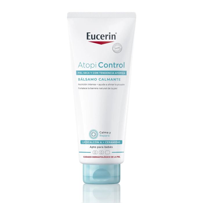 La piel atópica es irritable, seca y produce picores. Este picor induce a rascarse, lo que interfiere en el sueño por la noche y puede tener un impacto negativo en la calidad de vida. Eucerin AtopiControl Bálsamo Calmante es un bálsamo corporal de uso diario que se ha formulado especialmente para suavizar e hidratar intensamente la piel irritada y el picor. El ligero pero nutritivo bálsamo de agua en aceite está enriquecido con licocalcón A, ceramidas y manteca de karité para fortalecer la barrera de la piel y aliviar la sequedad y el picor. Se debe usar durante un brote junto a Eucerin AtopiControl Crema Forte, Eucerin Spray Calmante y su medicación habitual. El bálsamo para pieles atópicas ofrece una hidratación inmediata para una piel suave y tersa y, si se aplica habitualmente, mejora el estado de la piel de manera visible.El bálsamo sin perfume tiene una textura agradable y ligera que se absorbe rápidamente; además, no contiene grasas ni es pegajosa. Eucerin AtopiControl Bálsamo Calmante está dermatológicamente probado para la piel seca y atópica. Su uso es seguro desde el primer día en la piel frágil de recién nacidos y bebés, aunque solo puede aplicarse en la zona del pañal a partir del primer mes. Gracias a su fórmula sensible pero eficaz, también es ideal para niños y adultos, lo que lo convierte en un bálsamo para toda la familia que preserva la barrera cutánea y alivia activamente el picor de la piel.