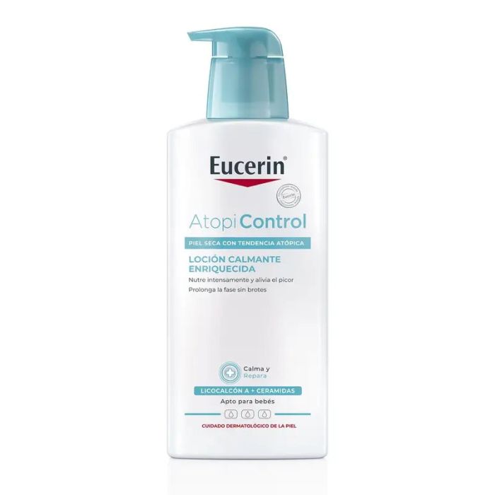 La piel atópica es seca, irritable y produce picores. Estos picores llevan a rascarse, lo que inicia el ciclo de picor-rascado. Los síntomas empeoran y pueden impedir dormir bien, así como tener efectos negativos en la calidad de vida.Eucerin AtopiControl Loción Calmante Enriquecida es una loción de uso diario para piel atópica , que se ha formulado especialmente para calmar e hidratar intensamente la piel irritada y el picor. La loción de agua en aceite se absorbe con rapidez y está enriquecida con licocalcón A, ceramidas y aceites omega para fortalecer la barrera cutánea, aliviar la sequedad y el picor y ayudar a prolongar el período entre brotes de dermatitis atópica. Su aplicación habitual mejora visiblemente la piel, que se nota suave y tersa. Eucerin AtopiControl Loción Calmante Enriquecida no tiene perfume, puede usarse también con Eucerin AtopiControl Crema Forte durante un brote, y se ha demostrado que favorece el sueño y mejora la calidad de vida de quienes sufren piel atópica. Apta para adultos, niños y bebés a partir de las cuatro semanas.