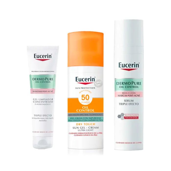 Sumérgete en el lujoso cuidado de la piel con el pack Eucerin Dermopure, una trinidad de productos diseñados para una tez impecable. El gel concertado triple efecto de 150 ml, ofrece una limpieza profunda, eliminando impurezas y controlando el exceso de grasa. El sérum triple efecto de 40 ml, potenciado con tecnología oil control, matifica y equilibra la piel, reduciendo imperfecciones. Además, el protector solar oil control FPS 50+ proporciona una defensa robusta contra los rayos UV, manteniendo tu piel fresca y protegida. Descubre la sinergia perfecta para una rutina de cuidado facial completa y radiante con Eucerin Dermopure.