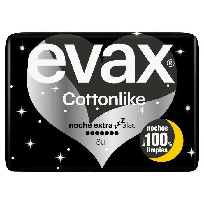Evax Cottonlike Noche Extra, 8 unidades, son unas ultracompresas con la parte