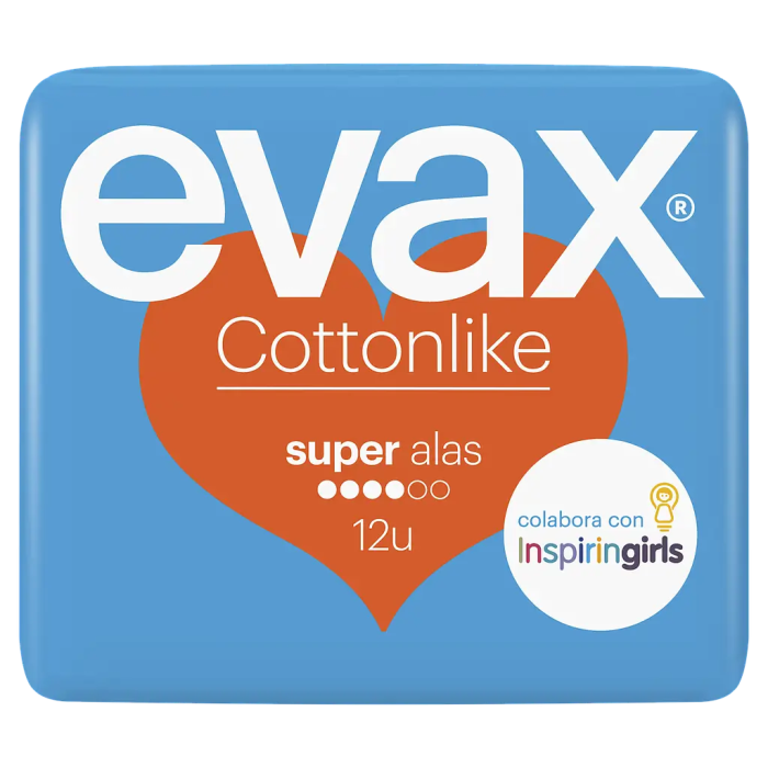 Evax Cottonlike Alas Super son unas compresas sanitarias ideales para los días con flujo abundante que cuentan con un sistema de perlas activas que neutralizan los olores, además de un núcleo que captura los líquidos de forma instantánea.