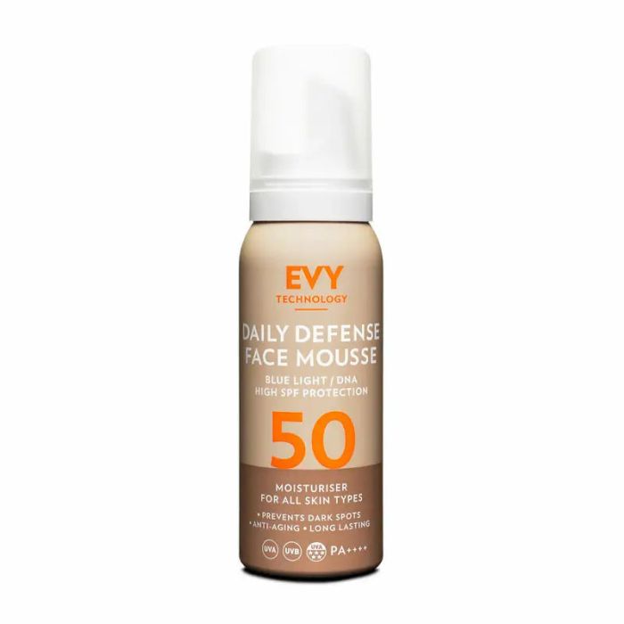 Evy Daily Defense Face Mousse SPF50 es un protector solar para el rostro con textura mousse ultra-ligera que ofrece una protección solar muy alta y de amplio espectro contra los rayos UVB y UVA .