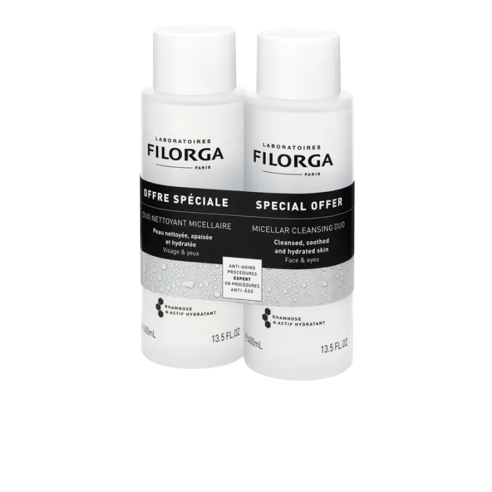 Dúo de limpieza en un pack ahorro que contiene dos unidades del AGUA MICELAR de Filorga, cada una de 400 ml.MICELLAR SOLUTION: Agua micelar 3 en 1 que limpia, desmaquilla e hidrata rostro y ojos.Utilizar por la mañana y por la noche.USO: Aplicar utilizando un disco de algodón y repetir hasta que el disco esté completamente limpio.