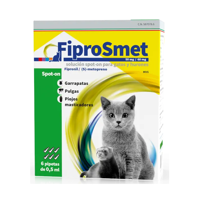 FIPROSMET pipetas antiparasitarias para gatos y hurones, 6 pipetas Fiprosmet, pipeta antiparasitaria para gatos y hurones que protege contra pulgas, garrapatas y piojos masticadores. Solución insecticida y acaricida para uso tópico en caja de 6 pipetas de 0,5ml Composición Composición por pipeta: Fipronil 50 mg (S) metopreno 60 mg Las pipetas fiprosmet contienen una solución insecticida y acaricida para uso tópico. El fipronil que elimina los parásitos adultos, sustancia activa adulticida y el (S) metopreno, que elimina los parásitos estado de larva y lo huevos, sustancia activa ovicida y larvicida.