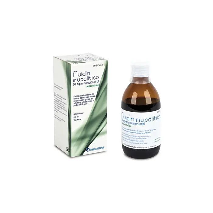 Cada ml de Fluidín Mucolítico contiene 50 mg de Carbocisteína como principio activo principal. El resto de excipientes son: sacarosa, p-hidroxibenzoato de metilo (E218), sal de sodio (E-219), p-hidroxibenzoato de propilo (E216), sal de sodio (E-217), esencia de frambuesa, esencia de agreste, esencia de naranja, esencia de cacao, caramelina, ácido clorhídrico para ajuste de pH, hidróxido sódico para ajuste de pH, agua desmineralizada.