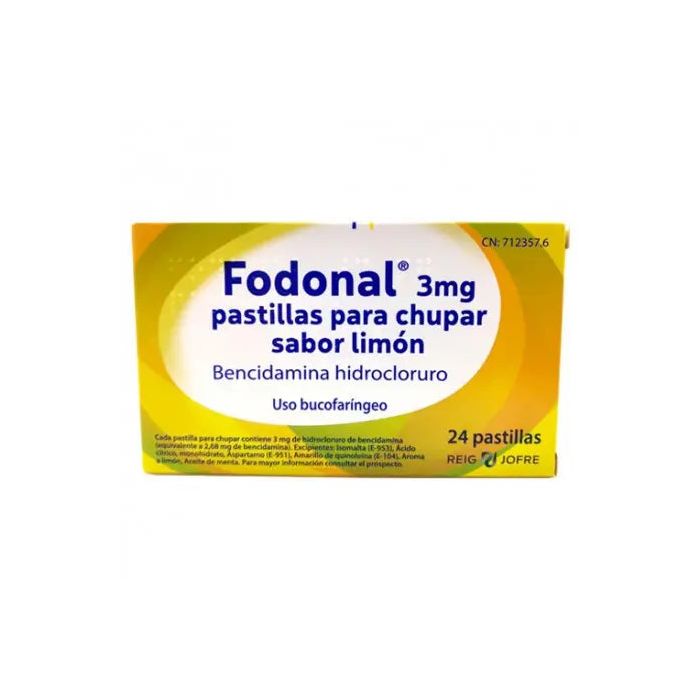 El principio activo de Fodonal Limón es la bencidamina. Cada pastilla contiene 3 mg de hidrocloruro de bencidamina (equivalente a 2,68 mg de bencidamina). Como excipientes: Isomalta (E-953), ácido cítrico monohidrato, aspartamo (E-951), amarillo de quinoleína (E-104), aroma a limón y aceite de menta.