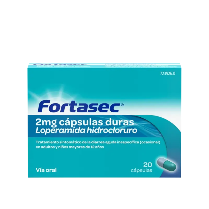 El principio activo de Fortasec es la loperamida. Cada cápsula Fortasec contiene 2 mg de loperamida hidrocloruro. El resto de excipientes son: Lactosa, talco, estearato magnésico y almidón de maíz. Gelatina, óxido de hierro amarillo (E172), dióxido de titanio (E171), indigotina (E132), eritrosina (E127) y óxido de hierro negro (E172).