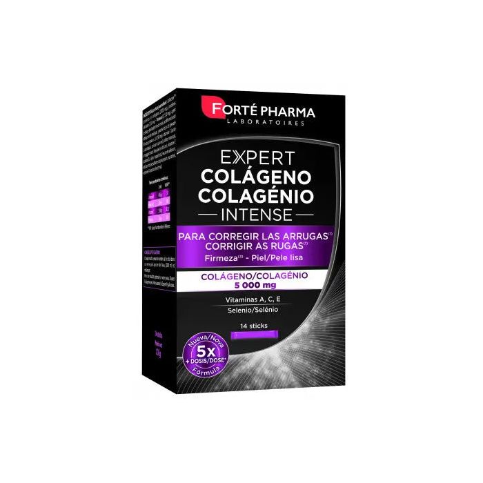 Expert Colágeno Intense de Forté Pharma Laboratories, es un tratamiento en sobres con fórmula altamente dosificada rica en péptidos de colágeno, vitamina A, C y E con poder antioxidante.Su ingrediente estrella es la quíntuple dosis de hidrolizado de colágeno que apoya el buen funcionamiento de la piel.