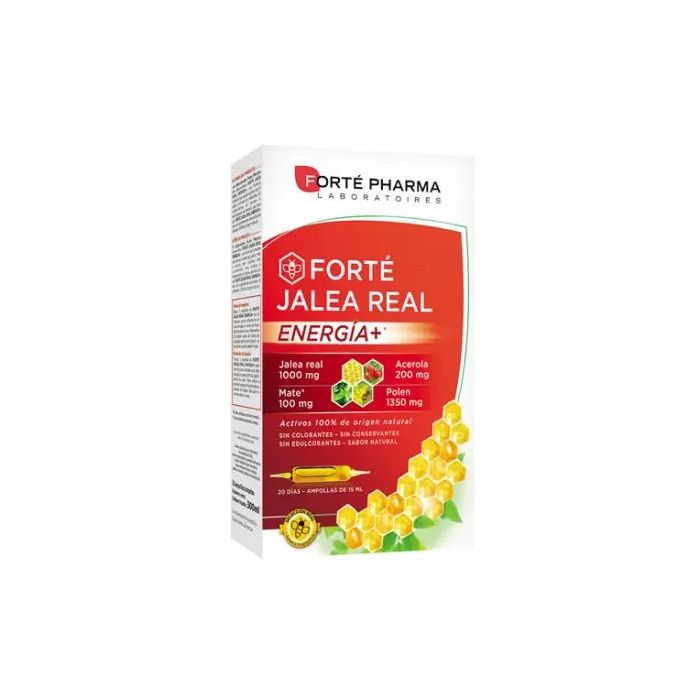 Forté Jalea Real Energía+ de Forté Pharma Laboratories, es un tratamiento oral en ampollas elaborado a base de jalea real y polen. La Jalea real es una sustancia segregada por las abejas fuente de hidratos de carbono, proteínas de alta calidad, lípidos, vitaminas del grupo B entre otros, que ofrece un gran aporte nutricional a nuestro organismo. Esta fórmula fusiona la jalea real con el polen, el mate y la acerola otorgando una carga nutritiva y revitalizante incomparable.