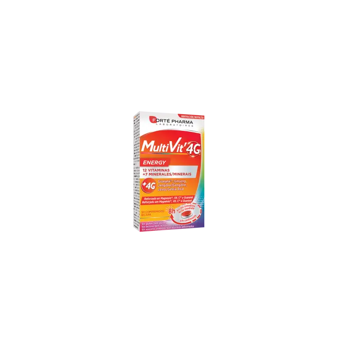 Multivit'4G Energía de Forté Pharma Laboratories, son unos comprimidos enriquecidos con 12 vitaminas que aporta el 100% mínimo de los valores nutricionales. Por su parte contiene los 7 minerales esenciales para el buen funcionamiento del organismo. Tambien incluye el complejo de plantas energizantes 4G, elaborado con Ginseng, Guaraná, Jalea Real y Jengibre, y está reforzado con Vitamina C, Magnesio.