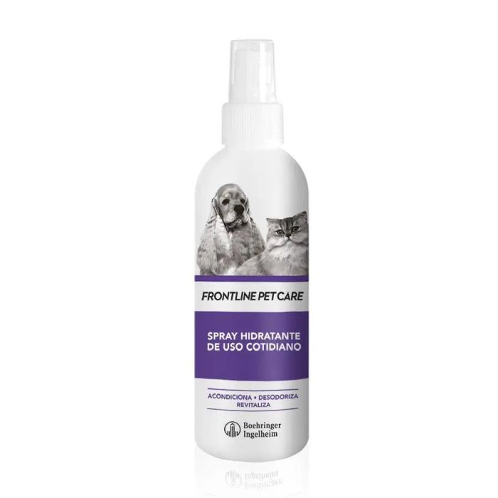 Frontline Pet Care Spray Hidratante de Uso Cotidiano 200 mlTras más de 20 años de liderazgo en el mercado de los antiparasitarios, Frontline da un paso más allá y lanza Pet Care, una completa gama de productos para la higiene y el cuidado de las mascotas. Esta nueva selección de productos, eficaces y seguros, se adpata a todo tipo de necesidades, con el único objetivo de mejorar el bienestar de las mascotas y ayudarles a disfrutar de una vida más sana y feliz.Como ingredientes comunes en todos los productos Frontline Pet Care se encuentran la Ramnosa y Luminescina, que ayudan a respetar el PH y el manto protector de la piel de las mascotas.La Ramnosa, es un azúcar de origen vegetal que protege la piel contra la degradación. Posee efecto desinfectante y calmante de anti-adhesión bacteriana. No tiene contraindicaciones y puede utilizarse inclusos en las pieles más sensibles.La Luminescina es un fitocomplejo estraído de la especie Verbascum thapsus, Gracias a su capacidad de convertir parte de la radiación ultravioleta en lus visible, aporta un brillo intenso al pelo. Actua también como potente protector frente a los rayos UV, gracias a sus propiedades antioxidantes.Frontline Pet Care Spray Hidratante de Uso Cotidiano es un spray acondicionador que favorece el cepillado diario de su mascota al mismo tiempo que la hidrata y protege de los agentes externos. Ideal para las áreas de piel seca e irritada. Además de la Ramnosa y Luminescina, este spray contiene aceite de macadamia, que ayuda a mantener la barrera de lípidos, creando una doble película de hidratación que refresca y protege la piel; y extracto de trigo, que también ofrece suavidad.