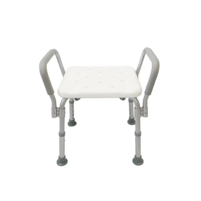 Banqueta de ducha regulable con reposabrazos, proporciona apoyo adicional.