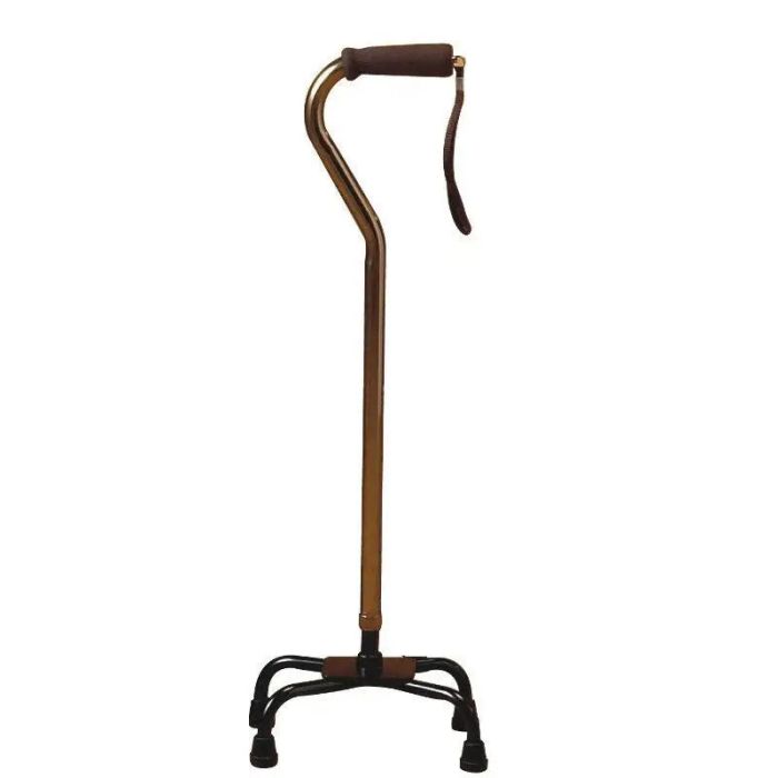 Material: aluminio. Empuñadura de espuma Regulable en altura: 75 -98 cm Medidas de la base: 22,5 x 17 cm Peso:1,5 Kg Peso máximo: 110 kg Diámetro de la contera: 12 mm. Ref. de la Contera: 832 Disponible en dos colores: Bronce: 352 Negro: 3521 Código HERA-CV: EMT 000A-502 Código SIRPO: E0006854 El cuadrípode es una ayuda técnica para la movilidad. Sirve para facilitar la marcha, aumentando la estabilidad, y disminuir el cansancio o carga al caminar sobre las extremidades inferiores, ya que permite descargar el peso de la pierna afectada.