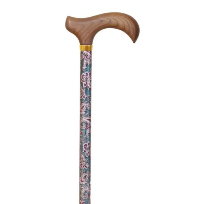 Los bastones están indicados para ser empleados por personas que tienen déficits funcionales en una o ambas extremidades inferiores provocados por patologías como la artritis y la artrosis o enfermedades neurológicas. El uso del bastón permite que el usuario pueda mantener independencia para desplazarse y ayuda a tener una buena calidad de vida, dinámica y activa. Existen muchas clases de bastones. Se fabrican con diferentes materiales, como la madera y el aluminio. Además, encontramos multitud de diseños que permiten a las personas elegir aquel que se ajusta más a su estilo, lo que aporta un valor añadido, sin que el bastón vea afectada su función principal de proporcionar equilibrio y alivio. Para que el bastón cumpla con su finalidad es necesario hacer un buen uso del mismo. Para ello, es necesario tener en cuenta lo siguiente: El agarre de la empuñadura del bastón debe ser el adecuado. El usuario debe sentir comodidad y seguridad en el apoyo de la mano, eligiendo la empuñadura que se adapte mejor a sus necesidades La medida debe abarcar desde la muñeca hasta el suelo en posición vertical. Dicho de otra manera, la altura óptima es la existente desde el trocánter mayor al suelo. Además, debemos comprobar el estado del punto de apoyo con frecuencia, puesto que una vez el caucho empieza a desgastarse, aumento el riesgo de caída y el bastón pierde adherencia y, por tanto, estabilidad. Esta muletilla extensible está fabricada en aluminio. El tubo es de color verde con estampado de cachemir en color burdeos y la empuñadura es de madera. Sus características principales son las siguientes: Material tubo: aluminio Material empuñadura: madera Longitud: 76-99 cm Diámetro del primer tubo 22 mm Diámetro del segundo tubo 19 mm Peso:0,300 Kg Peso máximo: 90 kg Diámetro de la contera: 19 mm. Referencias: 815/819/821/840/842/844