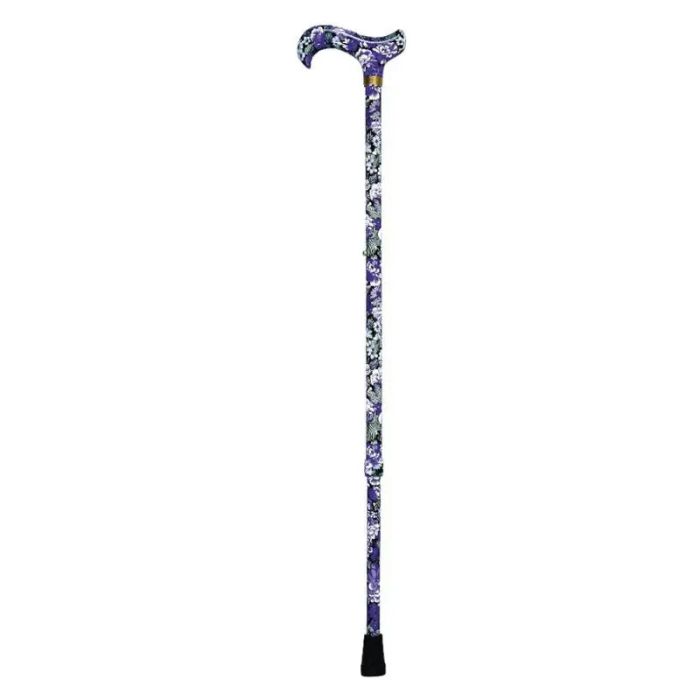 Los bastones están indicados para ser empleados por personas que tienen déficits funcionales en una o ambas extremidades inferiores provocados por patologías como la artritis y la artrosis o enfermedades neurológicas. El uso del bastón permite que el usuario pueda mantener independencia para desplazarse y ayuda a tener una buena calidad de vida, dinámica y activa. Existen muchas clases de bastones. Se fabrican con diferentes materiales, como la madera y el aluminio. Además, encontramos multitud de diseños que permiten a las personas elegir aquel que se ajusta más a su estilo, lo que aporta un valor añadido, sin que el bastón vea afectada su función principal de proporcionar equilibrio y alivio. Para que el bastón cumpla con su finalidad es necesario hacer un buen uso del mismo. Para ello, es necesario tener en cuenta lo siguiente: El agarre de la empuñadura del bastón debe ser el adecuado. El usuario debe sentir comodidad y seguridad en el apoyo de la mano, eligiendo la empuñadura que se adapte mejor a sus necesidades La medida debe abarcar desde la muñeca hasta el suelo en posición vertical. Dicho de otra manera, la altura óptima es la existente desde el trocánter mayor al suelo. Además, debemos comprobar el estado del punto de apoyo con frecuencia, puesto que una vez el caucho empieza a desgastarse, aumento el riesgo de caída y el bastón pierde adherencia y, por tanto, estabilidad. Esta serie de muletillas extensibles están fabricadas en aluminio estampado con diferentes motivos florales y fondo morado. Sus características principales son las siguientes: Material tubo: aluminio Material empuñadura: aluminio Longitud: 77-99 cm Diámetro del primer tubo 22 mm Diámetro del segundo tubo 19 mm Peso:0,300 Kg Peso máximo: 90 kg Diámetro de la contera: 19 mm. Referencias: 815/819/821/840/842/844