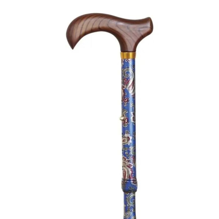 Muletilla plegable con estampado cachemir azul, puño de madera, diseño elegante