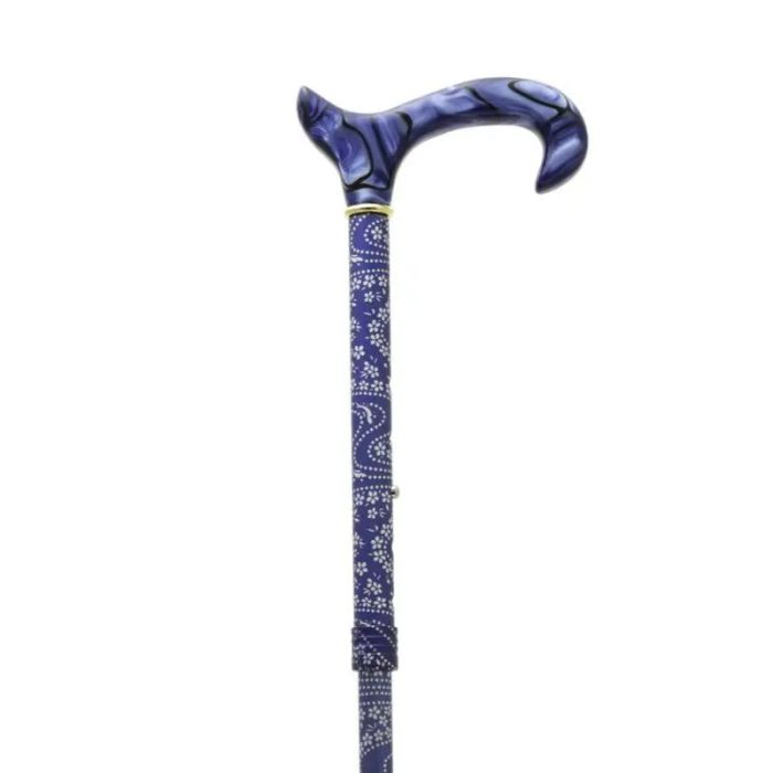 Muletilla plegable con estampado azul, puño de metacrilato azul, diseño elegante