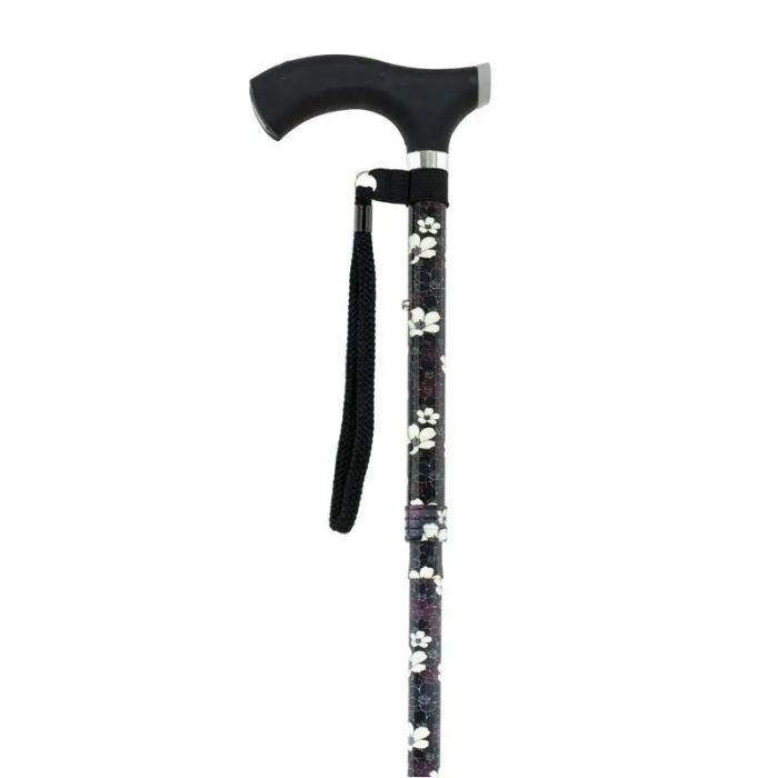 Muletilla plegable, con puño de tacto suave negro y decorado con flores blancas,