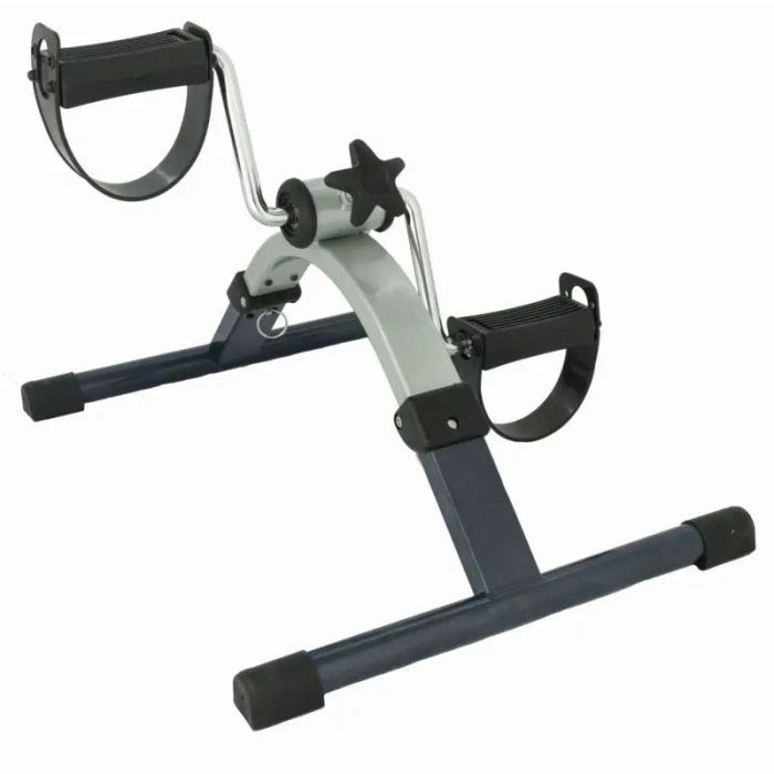 En los extremos de las patas cuenta con cuatro conteras para mejorar su agarre a la superficie donde se coloque. CARACTERISTICAS: Fabricado en acero con baño de cromo plateado Pedales de plástico (PP) Dispone de maneta de presión de pedaleo. Dimensión del producto: 48 x 37 x 24 cm Peso artículo: 2,3 kg RECOMENDACIONES DE USO: Este artículo esta diseñado para su utilización estando sentado. NUNCA UTILIZAR DE PIE Recuerde mantener una posición adecuada para la espalda y respirar correctamente. Ejercitese a su ritmo y no sobrecargue. Consulte con su médico antes de someterse a programas de ejercicio. Compruebe que el pedalier esté bien asentado sobre una superficie plana y resistente. Si fuera necesario, coloque una alfombrilla de goma para reducir la posibilidad de deslizamiento. Asegúrese de que hay suficiente espacio libre alrededor (aprox. 1 metro) cuando vaya a hacer el ejercicio. Vista ropa y calzado adecuado para hacer ejercicio evitando vestidos amplios o sueltos que puedan quedar atrapados al pedalear.
