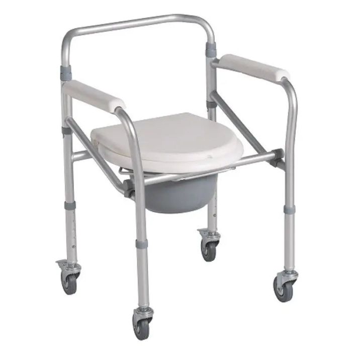 Las ruedas permiten desplazarla con mayor comodidad. Su estructura es de aluminio. Sus características son las siguientes: Fabricada a en aluminio con cubeta y tapas de plástico. Peso máximo: 100 Kgs Peso del artículo: 5,2kg Medidas: 53 x 49 cm. Ancho total 53 cm Medidas asiento: 38 x 39 Plegable y ajustable en altura: 45-59 Esta silla está indicada para personas con problemas de movilidad y que no son capaces de sostener su cuerpo sentado en el inodoro. También puede ser una opción para mejorar la calidad de vida de las personas que sufren de incontinencia urinaria. En esta sección también podrás encontrar banquetas y sillas de ducha que están pensadas para el inodoro. Instalarla al lado de este no dificulta el paso al ser abatible, pero ayuda a la incorporación o al traslado lateral cuando está desplegado.