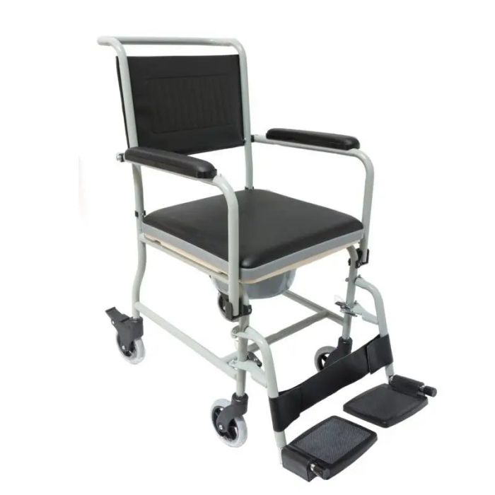Silla con inodoro y ruedas, móvil y funcional.