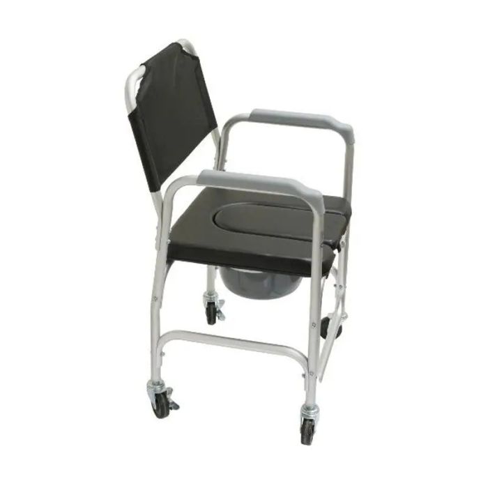 Las ruedas permiten desplazarla con mayor comodidad. Su estructura es de aluminio. El asiento en U facilita la higiene íntima. Sus características son las siguientes: Fabricada en estructura de aluminio y asiento PVC 4 ruedas 3” y bloqueo en las traseras Diámetro de las ruedas: 8 cm Cubeta de plástico Dimensión: Ancho: 55 cm. Profundo: 48 cm Distancia reposabrazos: 45,5 cm interior. 54 cm exterior Altura de asiento: 49 cm Alto total: 92 Peso producto: 6 kg Peso máximo: 100 kg Asiento: 43 x 43 cm Esta silla está indicada para personas con problemas de movilidad y que no son capaces de sostener su cuerpo sentado en el inodoro. También puede ser una opción para mejorar la calidad de vida de las personas que sufren de incontinencia urinaria, además de disfrutar de los beneficios de una ducha con seguridad.