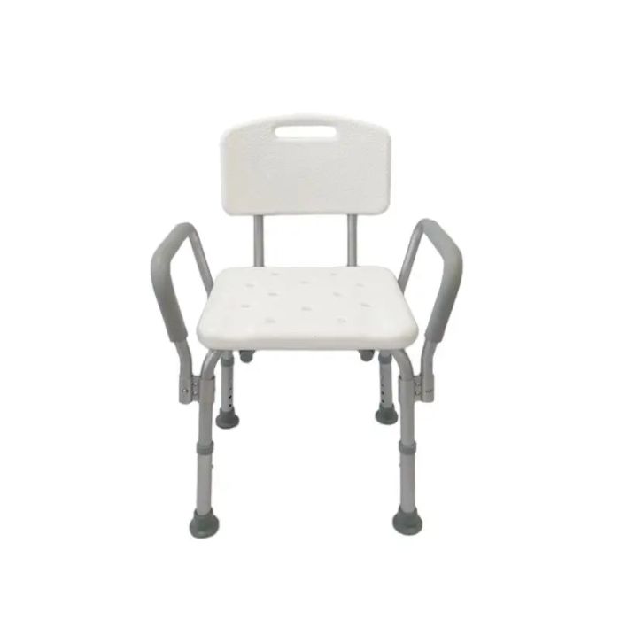 Silla de ducha regulable con reposabrazos, cómoda y segura.
