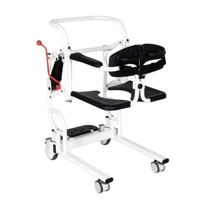 Una vez que el asiento está ajustado y el respaldo asegurado con el cinturón de seguridad, el paciente puede ser trasladado de manera segura. Gracias al respaldo suave, al asiento ergonómico y a los reposapiés, las personas pueden sentarse cómodamente. Viene con un soporte que recibe la tija telescópica. Para los cuidadores, el mango es muy cómodo y ergonómico. Características: Fabricado en acero Elevación hidráulica Se puede desmontar rápidamente y es fácil de transportar Ruedas con freno de estacionamiento Medidas: Altura empuñadura-suelo: 84 – 101 cm Altura asiento-suelo: 41-58 cm Asiento: 48 x 39.5 cm Anchura total: 60 cm Profundo: 78 cm Peso Neto: 28.5 Kg Peso Bruto: 31.5 Kg Peso máximo soportado: 100 Kg Embalaje: 90.5 x 59.5 x 32.5 cm Uso correcto Este producto debe utilizarse bajo la supervisión de un familiar, médicos, fisioterapeutas o enfermeras. La silla de transferencia sólo debe utilizarse en interiores, sobre una superficie plana para asegurar la estabilidad. No usar la silla en escaleras o escaleras mecánicas. La silla no debe transportar a más de una persona ni cargas adicionales. Este producto se utiliza únicamente para asistencia médica y no se puede utilizar como mobiliario general. La silla no debe transportar a más de una persona ni cargas adicionales. Precauciones: Cuando estacione, asegúrese de frenar las ruedas traseras Cuando baje o suba de la silla no se ponga de pie sobre los reposapiés. Reemplace las ruedas cuando estén desgastadas o no giren correctamente. Antes de cada uso, compruebe que el asiento y respaldo estén bien cerrados Aumente la prudencia durante el uso sobre alfombras, superficies mojadas, resbaladizas o nevadas. No utilizar sobre superficies heladas. No exceda el peso máximo