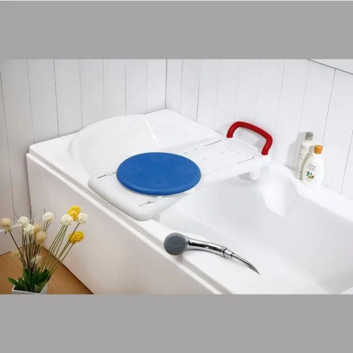 Esta tabla de bañera con asiento giratorio permite el acceso lateral a la bañera