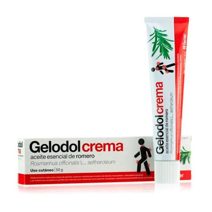 El principio activo de Gelodol es el aceite esencial de romero. Concretamente, cada gramo de crema contiene 100 mg de Rosmarinus officinalis L., aetheroleum (aceite esencial de romero).Como excipientes: triglicéridos de cadena media, octildodecanol, etanol (96 por ciento), glicerol (85 por ciento), alcohol cetoestearílico (Tipo A) emulsionante, glicerol monoestearato 40-55, trometamol, dimeticona, carbómeros y agua purificada.