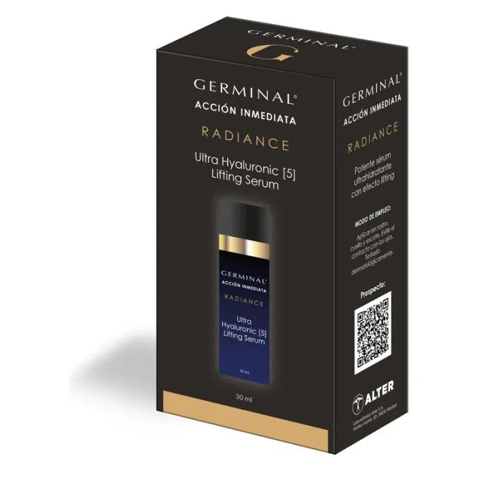 Formulado con tecnología avanzada, este suero se absorbe rápidamente en la piel, proporcionando una hidratación profunda y una sensación de firmeza instantánea. El ácido hialurónico, conocido por sus propiedades hidratantes, ayuda a retener la humedad en la piel, manteniéndola suave, flexible y radiante.Además, el suero GERMINAL ACCIÓN INMEDIATA RADIANCE ULTRA HYALURONIC [5] LIFT Sérum está enriquecido con ingredientes que ayudan a mejorar la elasticidad de la piel y a reducir la apariencia de líneas finas y arrugas. Esto proporciona un efecto lifting visible, dejando la piel con un aspecto más terso y juvenil.Este suero es adecuado para todo tipo de piel y puede ser utilizado tanto como un tratamiento intensivo antes de un evento especial, como parte de la rutina diaria de cuidado de la piel para mantener una apariencia fresca y luminosa. Con su acción inmediata y resultados duraderos, este suero es una excelente opción para aquellos que buscan revitalizar su piel y obtener un brillo radiante al instante.