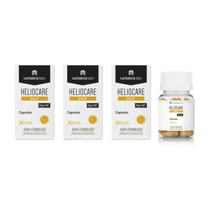 Heliocare 360º es un suplemento en forma de cápsulas que ayuda a proteger la piel contra los dañinos rayos solares. Estas cápsulas contienen ingredientes naturales como el extracto de Polypodium leucotomos, que tiene propiedades antioxidantes y fotoprotectoras. Este producto se utiliza como complemento a la protección solar tópica, ayudando a prevenir el envejecimiento prematuro de la piel, las manchas y los daños causados por el sol. Es recomendado para personas que pasan mucho tiempo al aire libre o que tienen una mayor sensibilidad a los rayos UV.