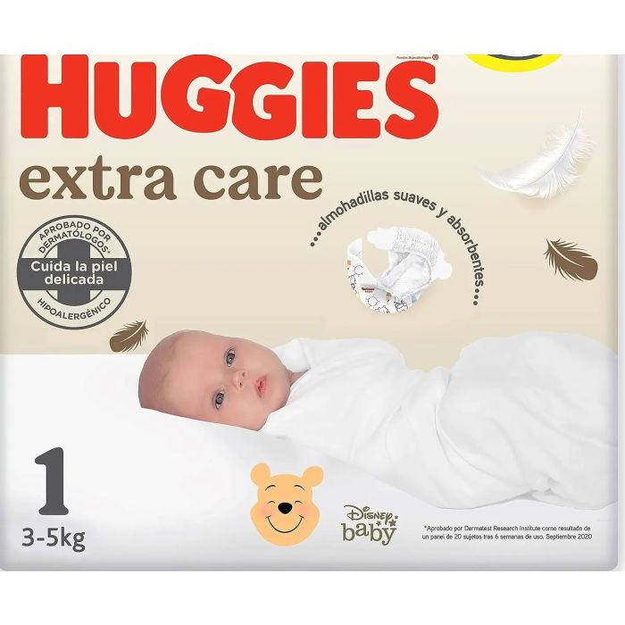 1. Los pañales Huggies Extra Care son adecuados para bebés con un peso de 3 a 5 kg.2. Tienen un diseño con elástico en la cintura para un ajuste cómodo sin apretar el estómago del bebé.3. Los pañales tienen cierres reutilizables que permiten abrochar y desabrochar varias veces si es necesario.4. Cuentan con un indicador de humedad que te recordará cuándo es necesario cambiar el pañal.
