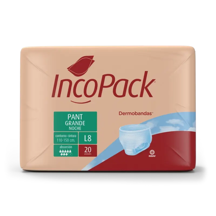 ¿Qué es y para qué sirve?Incopack trae una serie de prendas interiores absorbentes diseñadas para personas con incontinencia. Para usar de noche, ayudan a obtener una gran asimilación de orina, lo que fomenta a que el usuario se sienta más cómodo y seco.Su nivel de absorción es mayor a 900 -1200 cc y destaca por tener una barrera antifugas que ayuda a evitar derrames durante el descanso. Asimismo, tiene una tecnología que contribuye a la neutralización de olores para ayudar a la tranquilidad del usuario.Las prendas interiores absorbentes de Incopack disponen de un indicador de nivel de humedad que ayuda a verificar cuando es necesario realizar el cambio.Por ser de diseño ergonómico, los usuarios sienten que están llevando una prenda interior, lo que facilita su rutina diaria sin aportar preocupaciones. Las prendas de asimilación de orina disponen de una cintura anatómica que ayuda a una mejor adhesión en contornos de talla grande.La prenda absorbente tiene en el medio una compresa anatómica que contribuye a un ajuste perfecto en la zona de derrames o fugas. Cabe destacar que el diseño también tiene una capa de cobertura que destaca por liberar aloe vera y ácidos grasos esenciales.Su formato ayuda a proteger la piel de irritaciones, picores y alergias provenientes de la humedad. Contribuye también a la libertad de movimiento.¿Para quién está indicado?Colocar como si se tratará de una prenda interior y ajustar al cuerpo sin dejar pliegues ni rollos. Después del uso desechar de forma inmediata. No es un producto reutilizable.