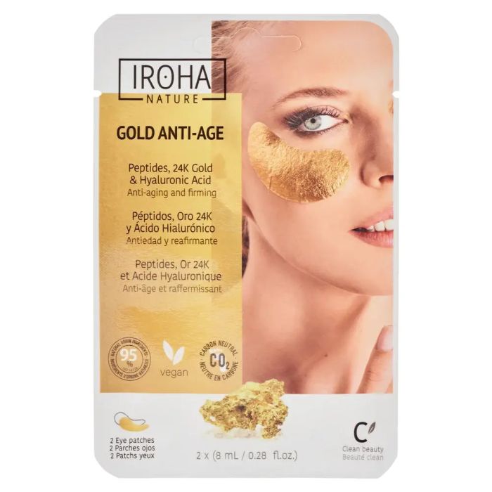 Los nuevos parches de ojos Antiedad de Iroha Nature reafirman el contorno de ojos y mejoran su elasticidad, previniendo la aparición de arrugas. Gracias a la innovadora Tecnología FOIL aplicada, los efectos del sérum se potencian y se obtienen unos mejores resultados. Entre sus activos principales se encuentran los péptidos, los cuales ayudan a retrasar el proceso de envejecimiento y reducir las arrugas y líneas de expresión que aparecen en el contorno de los ojos. También contiene Oro 24K, que mejora la luminosidad y la elasticidad de la piel, estimulando la síntesis de colágeno. Finalmente, la fórmula lleva ácido hialurónico que aporta una hidratación inmediata y de largo alcance al retener la humedad en la superficie cutánea. Apto para todo tipo de pieles. Es una fórmula clean con un 95% de ingredientes certificados de origen natural, no contiene alérgenos y es 100% vegano.