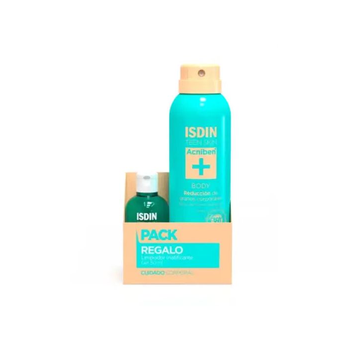 Pack Isdin Acniben que incluye loción corporal y gel limpiador, 150+50 ml.