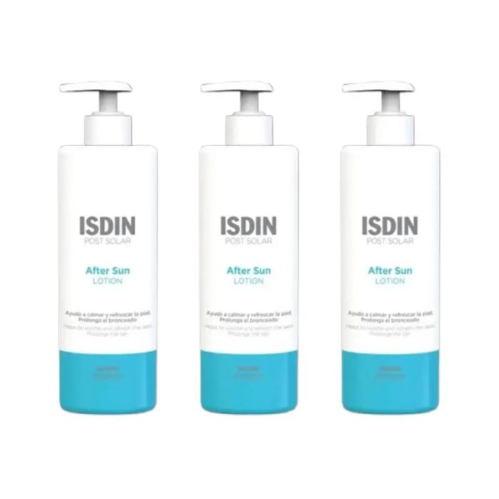 ISDIN AfterSun Loción Post Solar contiene: Aqua (Water), Alcohol Denat., Octyldodecanol, Cetyl Alcohol, Isopropyl Palmitate, Polysorbate 60, Dimethicone, Ethylhexyl Methoxycinnamate, Propylene Glycol, Benzyl Alcohol, Carbomer, Sorbitan Stearate, Allantoin, Sodium Hydroxide, Bisabolol, Disodium EDTA, Parfum (Fragrance), Menthol, BHT, Linalool, Citronellol, Chamomilla Recutita (Matricaria) Flower Extract, Geraniol, Limonene, Silica.