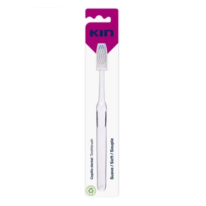 El cepillo dental KIN Suave, posee cerdas de dureza suave y mango anatómico forrado con pliegues que impiden que el cepillo se resbale de la mano, permitiendo utilizarlo con mayor facilidad.