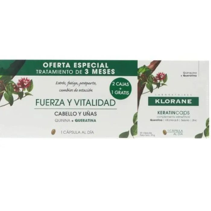 KLORANE – KERATINCAPS PACK 3X30 CÁPSULASKlorane KeratinCaps 3x30 Cápsulas es un complemento alimenticio elaborado a base de extracto de quinina, cuyas propiedades que aportan fuerza y vitalidad al cabello. Su fórmula también contiene vitaminas del grupo B, zinc, selenio y queratina, que aportan los micronutrientes esenciales para el crecimiento de un cabello fuerte y con buena salud.Para quién está indicadoEs un producto ideal para complementar el tratamiento anticaída tópico.VentajasSu combinación de ingredientes constituye un aporte nutricional óptimo para el cabello:- Queratina : es una proteína que actúa como reconstituyente del cabello.- V itamina B6: contribuye a la síntesis normal de cisteína, aminoácidos de azufre importante para el cabello.- Vitamina B8, Zinc y Selenio : ayudan a tener un cabello saludable.- Vitamina E : es un potente antioxidante que ayuda a reducir el estrés oxidativo.- Vitamina B3 : ayuda a reducir la fatiga.Formato Pack de 3x 30 cápsulas.Modo de empleoSe recomienda tomar 1 cápsula al día.Recomendación farmacéuticaEl ritmo de vida puede ser causante de la caída excesiva de pelo, por ello recomendamos que acompañes el tratamiento de Klorane con un champú anticaída y reduzcas los factores de estrés.- Mantener fuera del alcance de los niños.- No superar la dosis.- No utilizar como un sustituto de una dieta sana y equilibrada.- Mantener en lugar fresco y seco.ComposiciónIncluye: QUERATINA, VITAMINA B6, VITAMINA B8 (BIOTINA), ZINC Y SELENIO, VITAMINA E, VITAMINA B3.