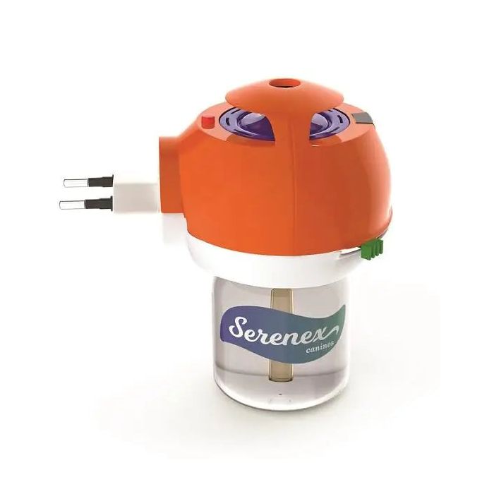 SERENEX® DIFUSOR CANINOSPresentación:Botella conteniendo 42 ml, con aparato difusor eléctricoDifusor eléctrico – FeromonoterapiaFeromonas de sincronía que calman y tranquilizanDescripción:SERENEX® Difusor Caninos libera a través de un vapor constante, feromonas M2. Estas feromonas, con acción análoga a las secretadas naturalmente durante la maternidad canina, ayuda a controlar conductas inadecuadas en los caninos. Estos comportamientos generalmente son consecuencia del estrés y la ansiedad ante situaciones desafiantes y se manifiestan por ejemplo con aullidos, destrucción de muebles y objetos, eliminación de orina y heces en lugares inapropiados, etc.En comparación con las feromonas naturales, las feromonas M2 tienen mayor estabilidad, nivel de difusión y residualidad en el medio ambiente.SERENEX® funciona tanto con cachorros, así como con perros adultos. Es una solución libre de fármacos, recomendada por los veterinarios para los problemas de comportamiento. Puede ser usado en conjunto con otras medicaciones u otros tratamientos.Indicaciones:SERENEX® Difusor Caninos es recomendado ante situaciones tales como:Destete y adaptación al nuevo hogar.Miedo a ruidos fuertes como truenos y fuegos artificiales.Ansiedad por momentos de soledad (aullidos y ladridos al quedarse solos en el hogar).Comportamientos compulsivos (lamido excesivo y autoagresión).Masticación destructiva.Eliminación de heces y orina en lugares inadecuados.Vocalizaciones excesivas (ladridos continuos, aullidos, etc.).Estrés ante la mudanza a un nuevo hogar.Estrés causado por cambios en el entorno, como muebles nuevos o remodelación.Estrés al socializar con otros canes.Estrés ante la llegada de un nuevo integrante al hogar (nacimiento de un bebé, adopción de otro animal).Modo de Aplicación:Cada frasco de SERENEX® Difusor Caninos dura aproximadamente 4 semanas de uso ininterrumpido. Es ideal colocar el aparato difusor en algún enchufe lejos de corrientes de aires o ventanas abiertas. La humedad y la ventilación excesiva del lugar pueden influir en la difusión de las feromonas, interfiriendo en la efectividad y duración del producto. SERENEX® Difusor Caninos cubre un área de hasta 70 m2. Se recomienda aplicar la menor intensidad para áreas de entre 30 y 40 m2, la mediana intensidad para áreas de 40 y 50 m2 y la mayor intensidad para áreas de entre 50 y 70 m2. En caso de problemas graves de conducta ajustar a la mayor intensidad de evaporación, independientemente de tamaño del área.El aparato difusor debe ser reemplazado después de 6 meses de uso y/o después del uso de 6 repuestos para asegurarse la correcta evaporación del líquido. Desenrosque la tapa del repuesto líquido y enrosque el mismo en el interior del aparato difusor de manera centrada, de modo que la mecha ingrese en el centro de la resistencia circular que se encuentra en la parte interior del aparato. No toque la mecha con los dedos. Compruebe que el frasco quede sujeto correctamente. Conecte el aparato siempre con el repuesto en posición vertical, girando el enchufe del mismo si fuera necesario para hacerlo coincidir con el de la pared. El aparato posee un botón de encendido/apagado y un ajustador de intensidad para regular el nivel de la evaporación. Una luz piloto en el aparato le indicará su puesta en funcionamiento. Cuando no quede líquido sustituya exclusivamente con SERENEX® Difusor Caninos repuesto. Una botella de 42 mL dura aproximadamente 30 días. Cuando no lo use por temporadas largas desenchufe el aparato, desenrosque el repuesto y colóquele la tapa para evitar que se evapore.