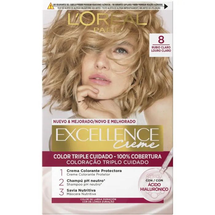 Nuevo y mejorado L'Oréal París Excellence Creme Tono 8 Rubio Claro, Color Triple Cuidado Avanzado con su nuevo ritual enriquecido y potenciado con Ácido Hialurónico, que atrae la hidratación gracias a su potente molécula. La nueva fórmula aporta 10x mas hidratación * y una mezcla de color 2x más cremosa**.Con activos protectores, protege y nutre tu cabello antes, durante y despues de la coloración con un 100% de cobertura de canas. Color radiante y de larga duración que junto a su Savia Nutritiva sella las cutículas para un cabello sin apelmazar.Cuida tu color, tu cuero cabelludo y tu pelo con Excellence Creme de L´ORÉAL PARIS.*Test instrumental ** vs mezcla colorante anterior (Crema colorante + Revelador), test instrumental de viscosidad.
