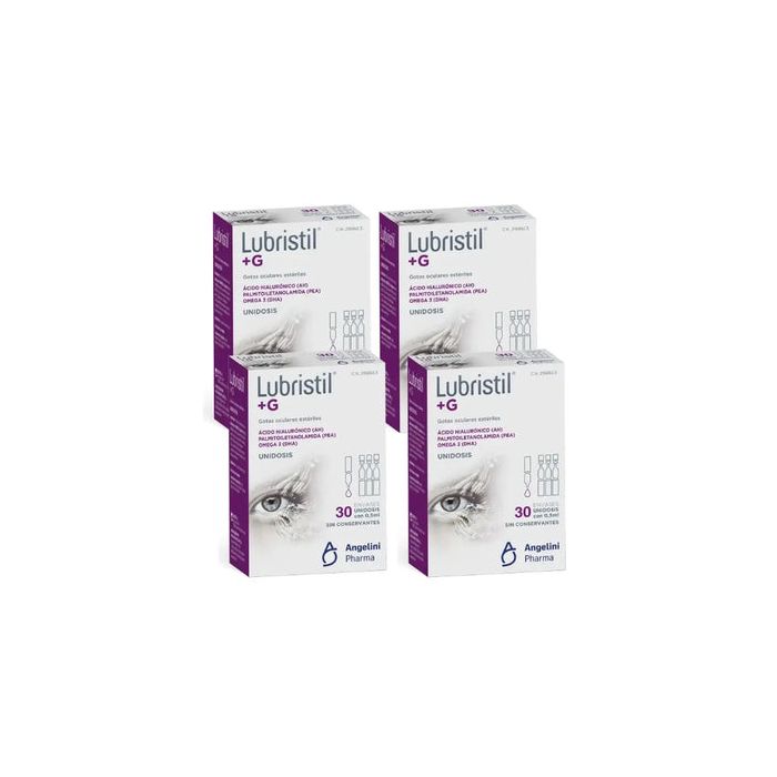Lubristil +G es una lágrima artificial estéril, indicada para hidratar, estabilizar y proteger la superficie ocular, en todos los casos de sequedad, ardor y fatiga ocular debido a tratamientos con colirios hipotensores, cirugías, lesiones o largas horas frente a pantallas, gracias a la combinación de ácido hialurónico (AH), PEA y Omega 3. Lágrima artificial sin conservantes.