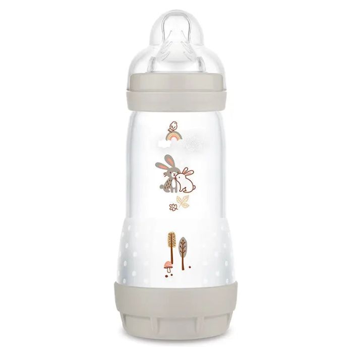 Producto de MAM España con instrucciones en castellano. Colección exclusiva con colores naturales en superficie mate y con ilustraciones de animales del bosque. Permite una alimentación relajada y sin cólicos gracias a su Base Ventilada Patentada que reduce las burbujas de aire y los cólicos. Confirmado por el 80% de las madres de bebés con cólicos en tests controlados en Austria 2011 y USA 2010. Tetina de silicona ultrasuave patentada SkinSoftTM aceptada por el 94% de los bebés* gracias a su tacto suave y similar a la piel de la madre y a su exclusiva forma plana que simula el pezón de la madre durante la lactancia. *Estudio de mercado 2010-2020 testado con 1.572 bebés. Biberón con tetina 3 de flujo rápido recomendado a partir de 4 meses con amplias aperturas que facilitan el llenado y la limpieza, tapa protectora a prueba de derrames que funciona como taza medidora. Fácil desmontaje para su limpieza y esterilización, sistema de auto-esterilización en 3 minutos al microondas.