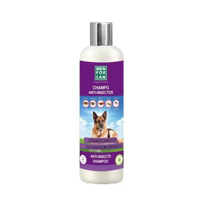 Tratamiento preventivo y repelente en champú para perros El champú anti insectos para perros de Menforsan tiene activos repelentes 100% naturales que previenen a tu mascota de pulgas, garrapatas, ácaros, piojos y mosquitos.Es un tratamiento preventivo y repelente que se puede utilizar de manera frecuente gracias a su pH adaptado a la piel de los perros. La combinación de los componentes como la margosa, el geraniol y el lavandino actúan de diferentes formas para proteger la salud del animal. La margosa elimina los insectos que se encuentren en la piel y el pelaje durante el lavado gracias al efecto repelente, y el geraniol y el lavandino previenen de las infestaciones con una prevención extra después del lavado. De esta forma eliminarás los posibles parásitos externos que ya tenga tu mascota y la protegerás para que no vuelva a cogerlos. Este champú no sólo funciona como repelente natural de pulgas, garrapatas y otros insectos, también hidrata y repara el pelo gracias a los colágenos de su composición. Es un producto adecuado para todas las razas y para todos los tipos de pelo: pelo corto, largo, rizado y liso. Sólo tendrás que utilizarlo como cualquier champú para perros, dejándolo actuar por un rato para que sus propiedades repelentes y reparadoras actúen con mayor efectividad cuidando el manto y la piel de tu mascota. VENTAJAS DEL CHAMPÚ MENFORSAN PARA PERROS: Champú para perros con repelentes naturales. Protección y prevención de pulgas, garrapatas, piojos, mosquitos y ácaros. Elimina los insectos ya presentes en la piel y previene de nuevos parásitos. Hidrata y repara el pelo dañado. PH adaptado a la piel del perro para un uso frecuente de forma segura. USO Y ESPECIFICACIONES: Champú preventivo y repelente de insectos adecuado para la protección contra pulgas, garrapatas, mosquitos y otros parásitos externos en perros de cualquier raza y pelaje. Recomendaciones de uso: Moja el pelo de tu mascota al igual que en sus baños habituales. Aplica el champú Menforsan por todo el cuerpo excepto en la cara. Masajea el pelo hasta que el champú coja forma de espuma en abundancia y déjalo actuar un par de minutos. Retira los restos de jabón con el agua y deja que tu perro se sacuda. Sécalo con la toalla y después con el secador. Por último cepilla el pelaje. Composición: Margosa Extract, Geraniol, Lavandin Oil, Aqua, Sodium Laureth Sulfate, Polyquaternium 7, Glycerin, Cocamidopropylbetaine, Sodium Chloride, Cocamide DEA, Collagen Amino Acids, Chloromethylisothiazolinone, Methylisothiazolinone, Parfum(d-limonene), C.I 16255. Formato: 300 ml Menforsan champú anti insectos para perros tiene activos repelentes naturales que repelen los parásitos externos para proteger a tu mascota.