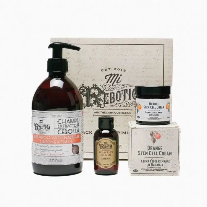 Un buen regalo para descubrir los productos de Mi Rebotica. Crema Células Madre Naranja 60 ml: La crema de células madre Mi Rebotica es una emulsión formulada con células madre procedentes de la naranja, aceite de rosa mosqueta, extracto de ginkgo biloba, vitaminas A, E, B5, H, omega 3 y omega 6. Las células madre de naranja contribuyen a la organización y redensificación la estructura de la dermis, ayudando a mejorar la matriz extracelular, consiguiendo una piel más firme, mientras que las vitaminas y la rosa mosqueta nutren la piel, haciendo de esta crema el cuidado diario facial que toda piel necesita. Champú con Extracto De Cebolla 500 ml: Champú de uso frecuente, aporta brillo, suavidad y crecimiento. Además, ayuda a fortalecer el cabello y gracias a su capacidad antioxidante, lo protege de los procesos oxidativos. Con olor a cereza. Agua Micelar 50 ml: Limpia y desmaquilla la piel en profundidad, manteniéndola cómoda, elástica e hidratada, sin percepción de sequedad o untuosidad. Es respetuosa con las pieles delicadas, y tiene un efecto calmante por su contenido de aloe vera.