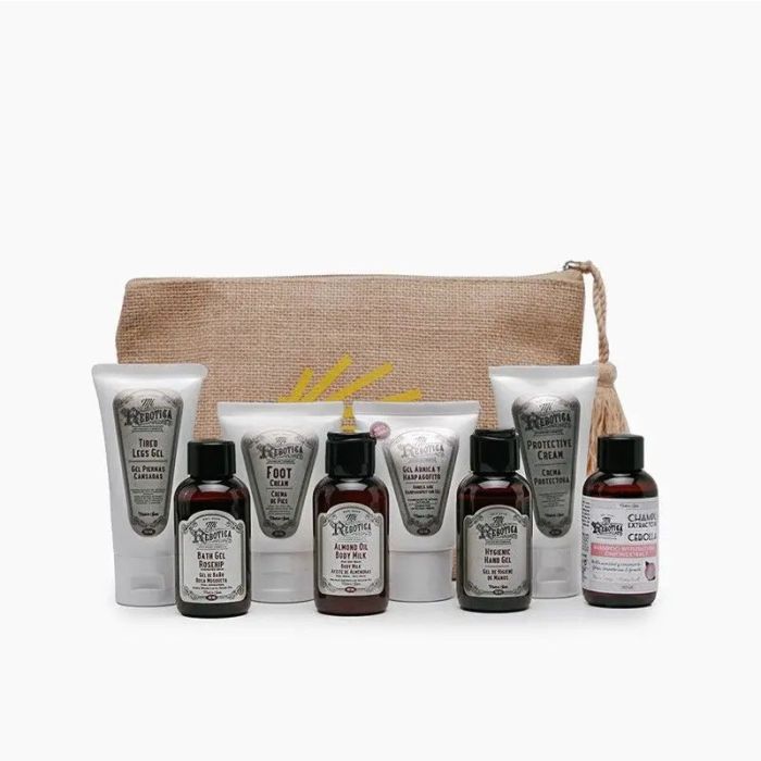 Pack viajero ideal para rutas y viajes. Un set completo con todo lo que puedes necesitar en tu viaje. Gel de baño rosa mosqueta 50 ml: El gel de baño de rosa mosqueta, es dermoprotector, hidratante y regenerador por su contenido en aceite de rosa mosqueta. Aporta suavidad a nuestra piel, dándole elasticidad. Body milk Aceite de almendras 50 ml: La loción corporal con aceite de almendras Mi Rebotica contiene como ingrediente principal aceite de almendras dulce, que suaviza, hidrata y protege las pieles sensibles y delicadas. Champú con extracto de cebolla 50 ml: Champú formulado con extracto de cebolla y sin olor a cebolla. El extracto de cebolla es un estimulante del crecimiento capilar, además ayuda a fortalecer el cabello y gracias a su capacidad antioxidante protege el cabello de los procesos oxidativos. Pasta al agua 50 ml: La pasta al agua Mi Rebotica por su alto contenido en óxido de zinc y talco es ideal como crema protectora de la piel frente a factores externos, como el roce o la humedad, ya que forma una ligera película sobre la piel. Además, presenta propiedades hidratantes, emolientes, reparadoras y calmantes, gracias al aloe vera y al aceite de caléndula. Gel árnica y harpagofito 50 ml: El gel de masaje con Árnica y Harpagofito Mi Rebotica conjuga sinérgicamente las acciones de sus cuatro ingredientes activos (árnica, harpagofito, metilsalicilato y mentol) para ofrecer un efecto calmante. Acompañado de un masaje adecuado proporciona una sensación de alivio y bienestar. Gel piernas cansadas 50 ml: El gel de piernas cansadas asocia una multitud de activos (extracto de vid roja, de ginkgo biloba, de castaño de indias, de ruscus, de hiedra, mentol y alcanfor) seleccionados especialmente para ayudar a refrescar, aliviar y relajar las piernas cansadas. Crema de pies 50 ml: Crema reparadora de uso diario que hidrata en profundidad los pies secos y agrietados. Con aceite de aguacate y urea; agentes suavizantes e hidratantes que ayudan a mantener el equilibrio hídrico-lipídico necesario para conseguir la elasticidad y suavidad de la piel en los pies. Gel higienizante 50 ml: Indicado para la higienización de las manos sin necesidad de enjuagar con agua tras su aplicación. Enriquecido con Glicerina, cuida la piel gracias a los agentes hidratantes incluidos en la formulación del producto.