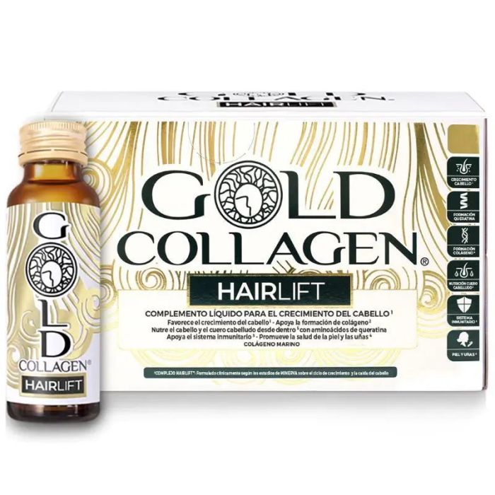 "GOLDCOLLAGEN® HAIRLIFT desarrollado para embellecer y satisfacer las necesidades de cabello de hombresy mujeres. HAIRLIFT está formulado por nuestros científicos y nutricionistas para ofrecer unacombinación única de 18 ingredientes activos, incluido el extracto de Rúcula para estimular el crecimiento del cabello, además de queratina hidrolizada, colágeno hidrolizado, biotina, selenio, vitaminas y minerales. Seleccionados cuidadosamente por sus beneficios para el crecimiento y el cuidado del cabello, se mezclanen un complemento líquido con sabor a piña, melocotón y mango para una absorción y biodisponibilidadóptimas, todo ello del experto en colágeno desde 2011.