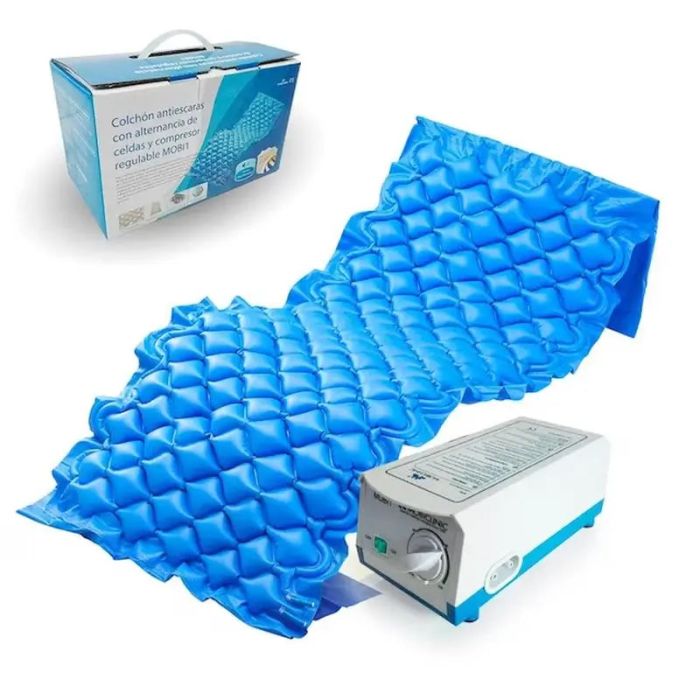 Por otro lado, el compresor del colchón antiescaras es compacto, fiable, muy silencioso y de fácil manejo. Se puede ajustar a la cama y se puede regular la presión del mismo. Dispone de 130 celdas que proporcionan un tratamiento de máxima calidad, es muy fácil de limpiar gracias a su material. Está fabricado con PVC de grado médico de máxima calidad y material ignífugo. El colchón antiescaras Mobi1 está diseñado para la alternancia de celdas y ajuste según el peso del paciente. Sus celdas individuales se inflan y se desinflan en periodos de 6 minutos, recibiendo de esta manera el paciente un constante alivio de la presión, activando la circulación y previniendo la formación de escaras. ¿Qué son las escaras? Las escaras o úlceras por presión son lesiones o heridas que se desarrollan en la piel debido a la presión que ejerce el hueso sobre la piel en pacientes que se encuentran inmovilizados durante un periodo prolongado de tiempo. Pueden causar infecciones graves. Características técnicas del compresor del colchón antiescaras: Potencia: AC 220V 50 Hz, 0.1A Caudal de aire: 6-8 litros/minuto Rango de presión: 40-100mmHg Duración del ciclo: 6 minutos Decibelios: 33 - 34 dB Medidas: 23cm largo x 11,5cm ancho x 10cm altura Peso: 1 kg Características técnicas del colchón: Color: Azul. Fase de escaras I Material: PVC de grado médico de máxima calidad y material ignífugo Medidas hinchado: 200 x 90 x 7 cm Medidas deshinchado: 232 x 100 cm Dotado de 130 celdas Peso: 2 kg Peso máximo del usuario: 135 kg Disponible en otros colores. Este colchón ortopédico nos gusta por: La utilidad que tiene para prevenir las escaras. Su ajuste según el peso de la persona. La facilidad con la que se puede limpiar. Los colchones antiescaras NO se pueden devolver una vez que se haya inflado el colchón. Para la devolución de este producto, su embalaje original tiene que estar intacto. MUY ÚTIL: Este colchón antiescaras de aire está indicado para personas que pasan largos periodos de tiempo encamadas y tienen un riesgo grado 1 de UPPs (ulceras por presión). Las celdas se inflan y desinflan, adaptándose al peso del usuario (hasta 135 kg) EFICACIA TERAPÉUTICA: sus 130 celdas individuales de aire se inflan y desinflan alternativamente en periodos de seis minutos, ayudando a reducir el dolor del paciente y aliviando la presión. Este proceso reduce la fricción con el colchón antillagas mejorando la circulación sanguínea y evitando la aparición de escaras RÁPIDO, FÁCIL DE LIMPIAR Y TRANSPORTAR: por su diseño, el colchón antiescaras es muy práctico, permitiendo una fácil limpieza y mantenimiento. Además, gracias a sus medidas y su peso ligero, podrás transportarlo donde te apetezca ACCESORIOS: incluye motor compresor y un kit de reparaciones con dos parches. Además, hay disponibles repuestos de colchones y compresor SEGURIDAD: este colchón antiescaras con motor está fabricado con PVC de grado médico de máxima calidad y material ignífugo MÁS RESISTENTE Y EFECTIVO: Gracias a que contiene más plástico, el colchón pesa en torno a 2 kilos y refuerza la resistencia a la presión en sus celdas. Esto garantiza su efectividad en el paciente con total comodidad
